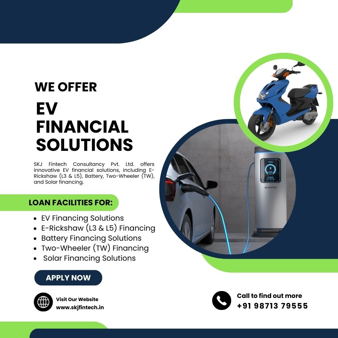 At SKJ Fintech Consultancy Pvt. Ltd., we provide comprehensive financial solutions to support the growth of electric mobility and renewable energy. Our services are designed to make EV ownership and clean energy adoption more accessible and affordable through flexible financing options.